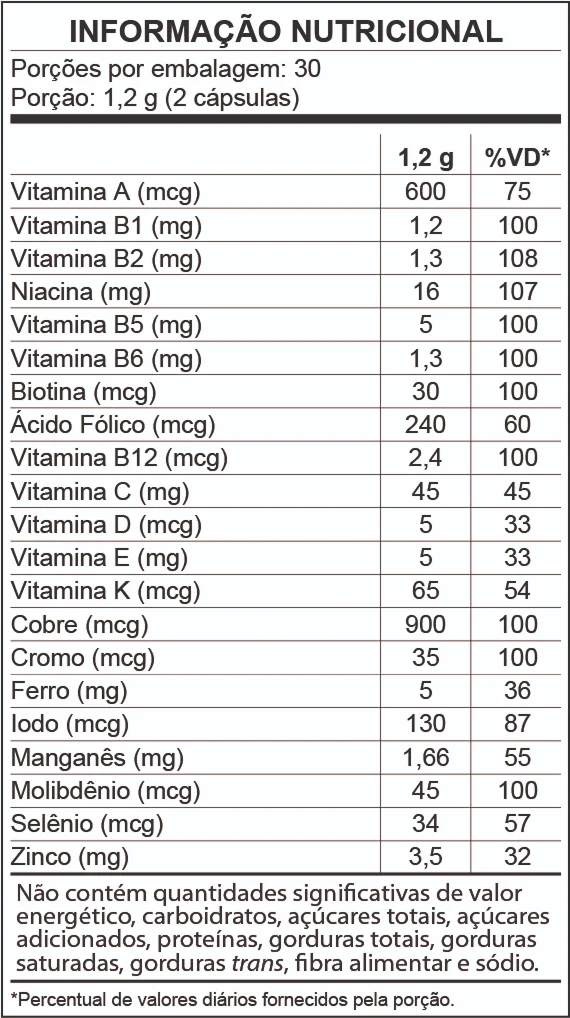 Ácido ascórbico, bisglicinato ferroso, bisglicinato de zinco, niacina, acetato de d l alfa tocoferol, bisglicinato de manganês, D- pantotenato de cálcio, bisglicinato de cobre, selenito de sódio, cloridrato de piridoxina, tiamina, riboavina,tonadiona, acetato de retinol, picolinato de cromo, ácido fólico, Iodeto de potássio, molibdato de sódio, D-biotina, colecalciferol, cianocobalamina, antiumectantes silicato de magnésio, e dióxido de silício.
